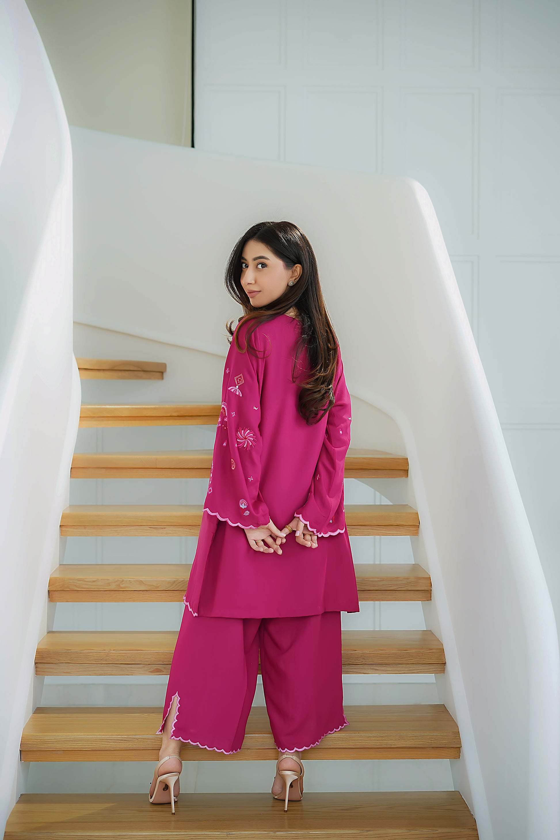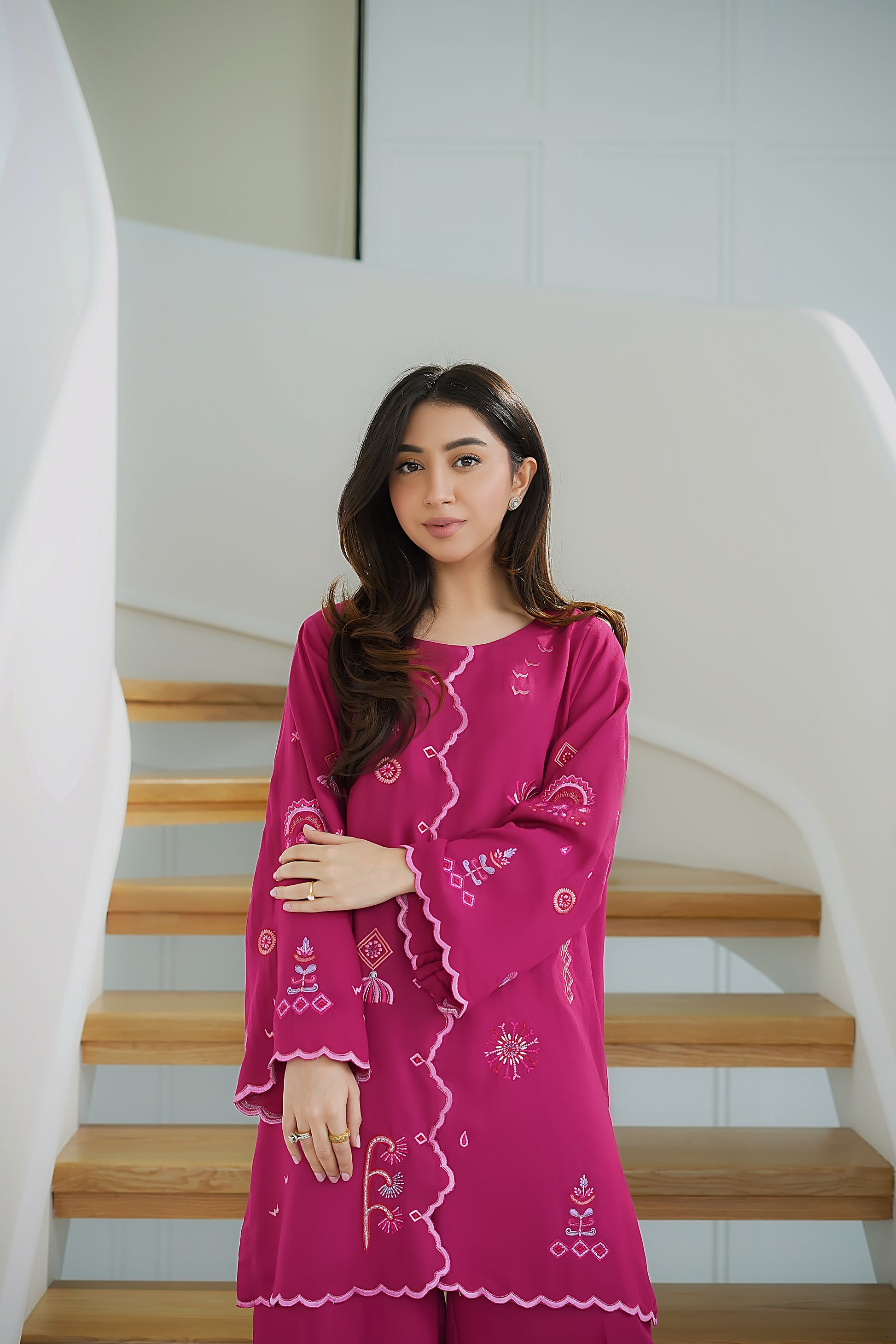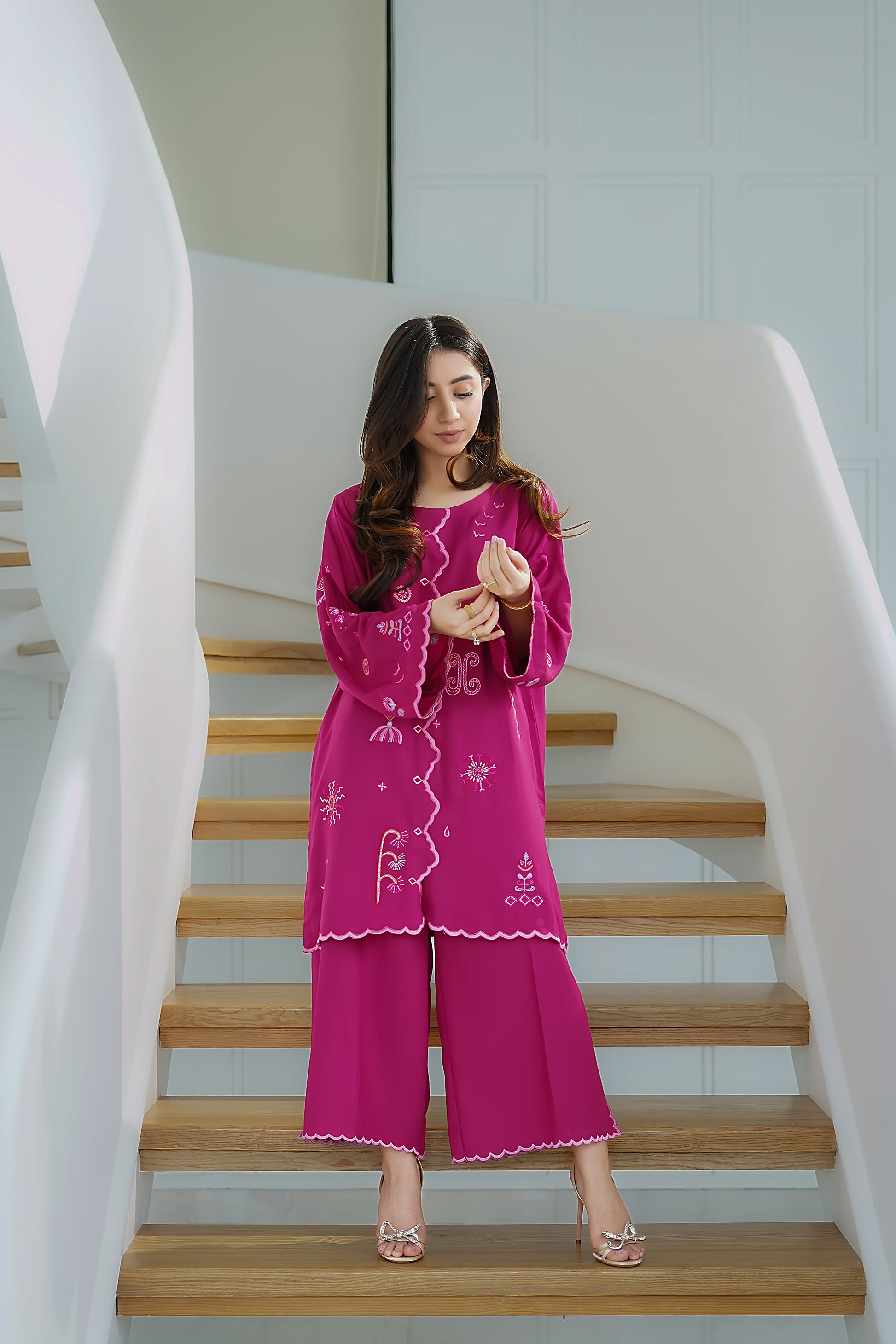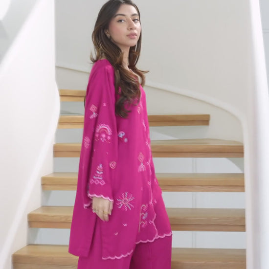 Make a statement in this vibrant Silk Karandi 2-piece set, designed in a rich fuchsia hue. The kurta features whimsical embroidery in contrasting pastel threads, accentuated by a wavy front placket and scalloped borders for a playful yet refined finish. Paired with wide-legged trousers that mirror the scalloped detailing, this ensemble is perfect for daytime charm or evening elegance.