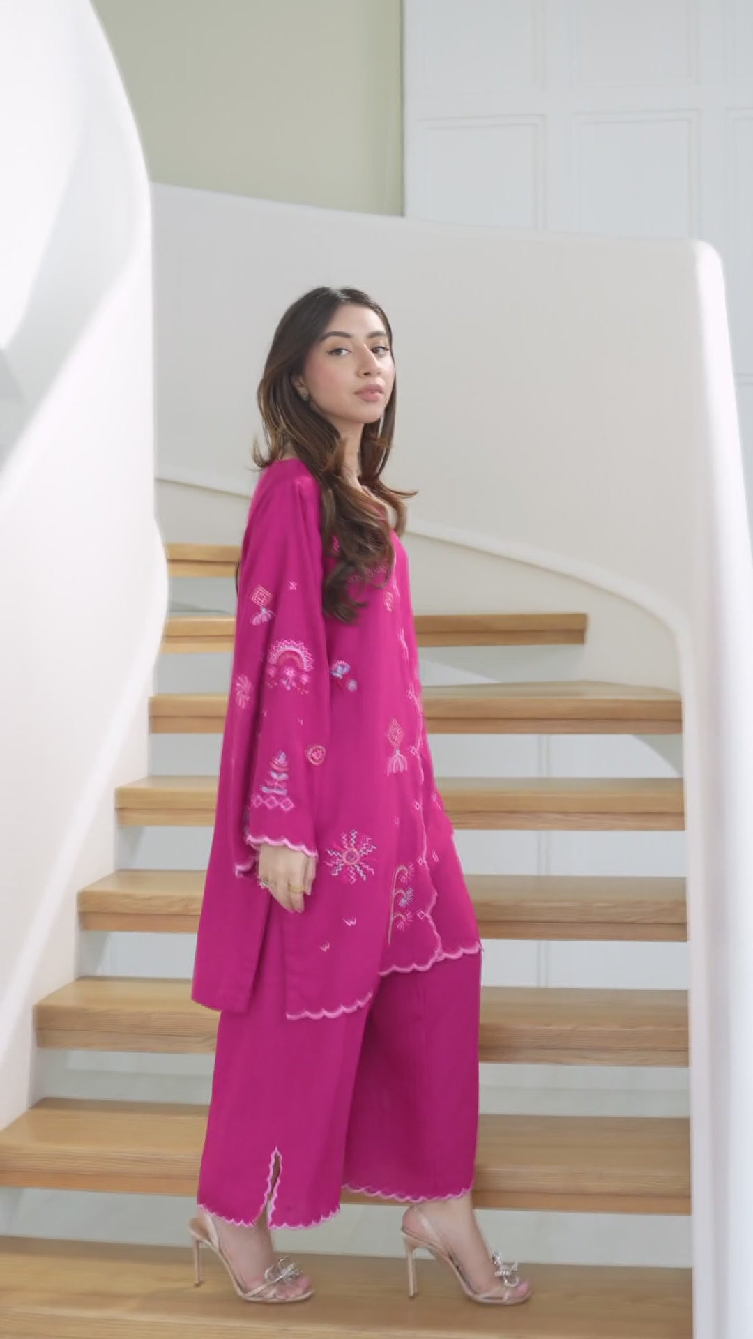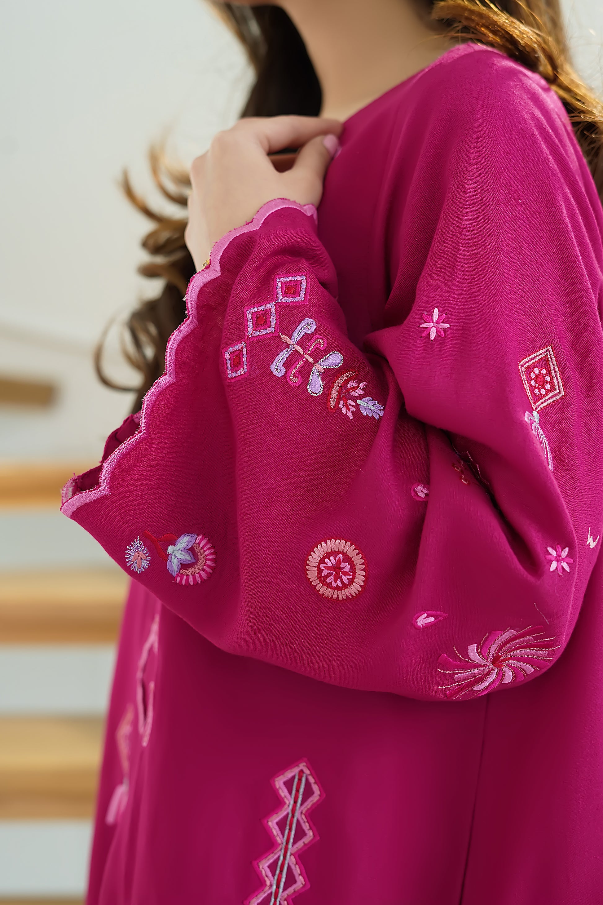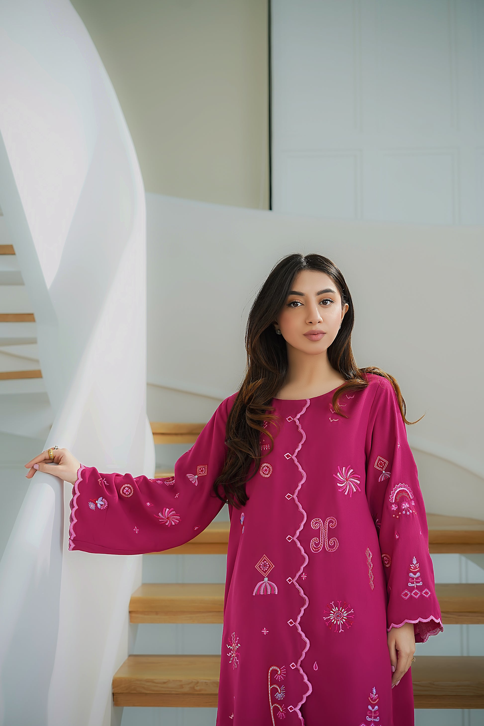 Make a statement in this vibrant Silk Karandi 2-piece set, designed in a rich fuchsia hue. The kurta features whimsical embroidery in contrasting pastel threads, accentuated by a wavy front placket and scalloped borders for a playful yet refined finish. Paired with wide-legged trousers that mirror the scalloped detailing, this ensemble is perfect for daytime charm or evening elegance.