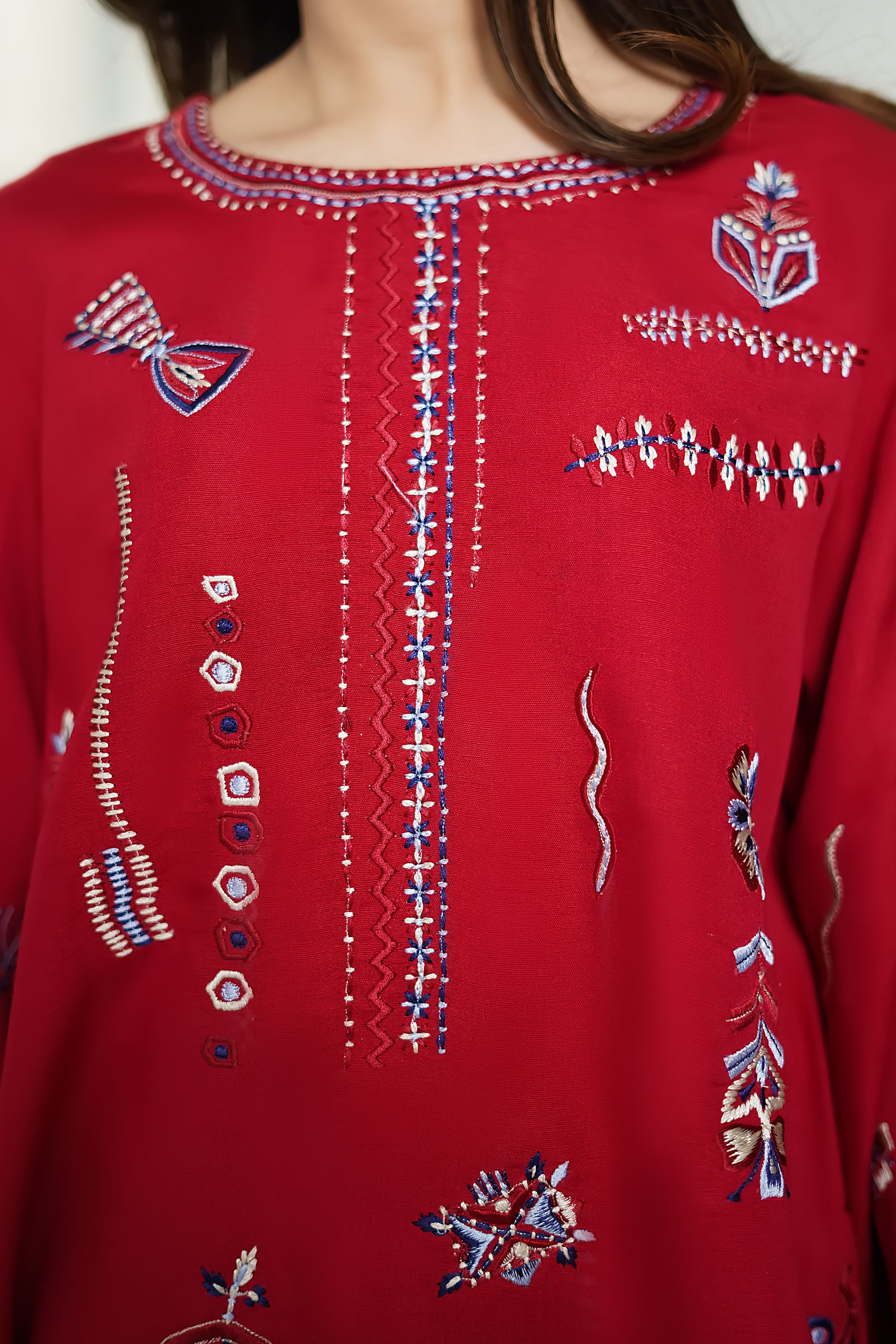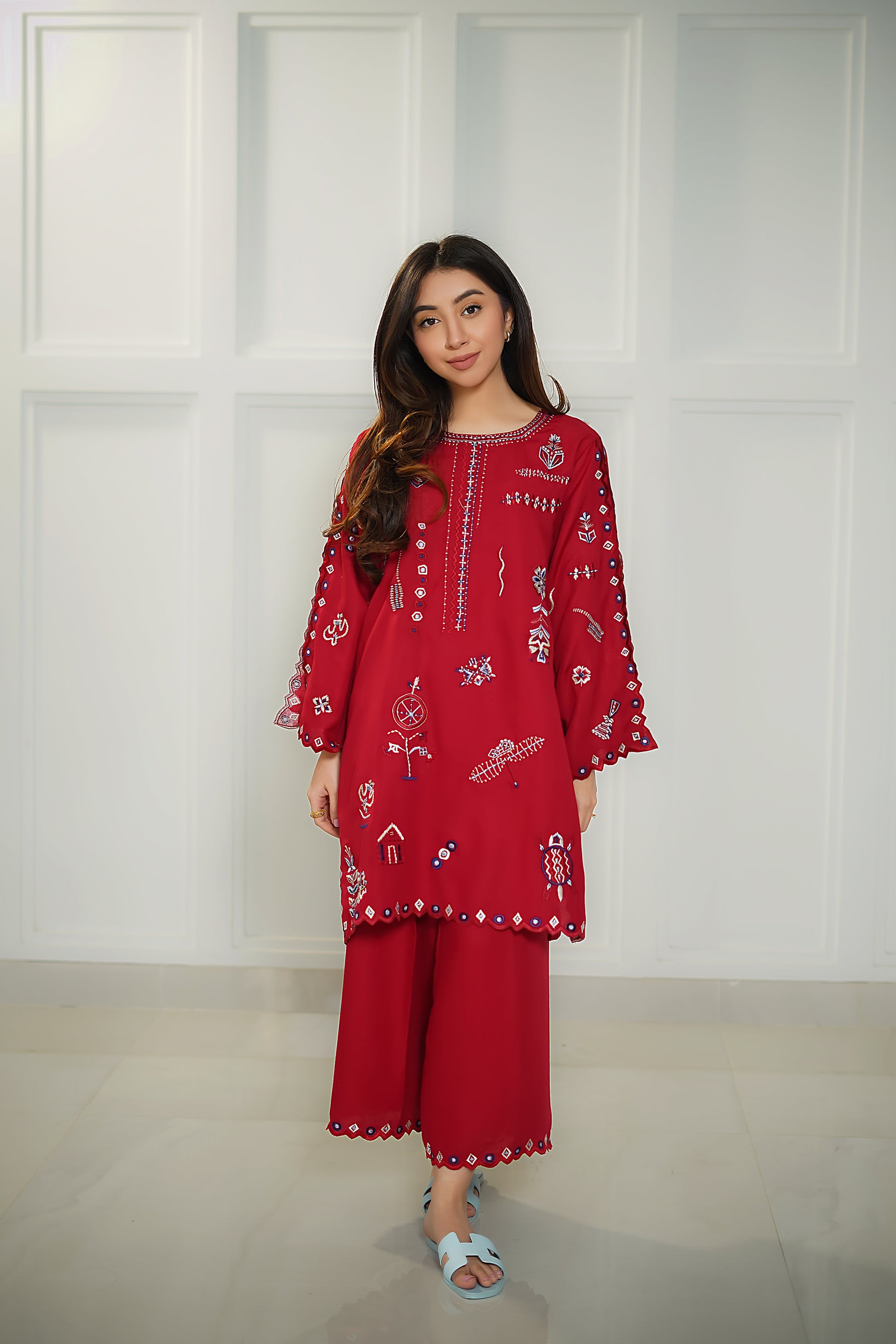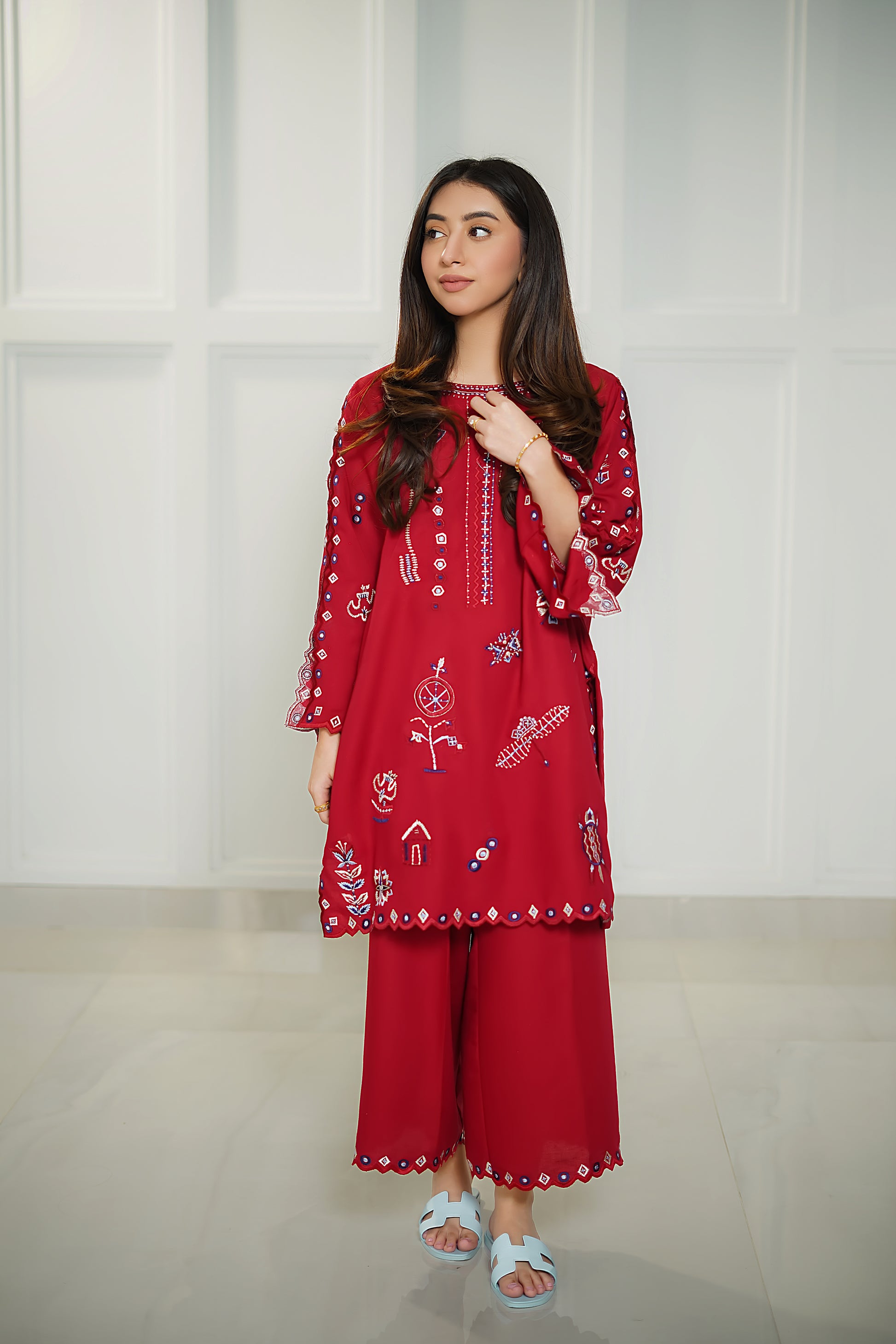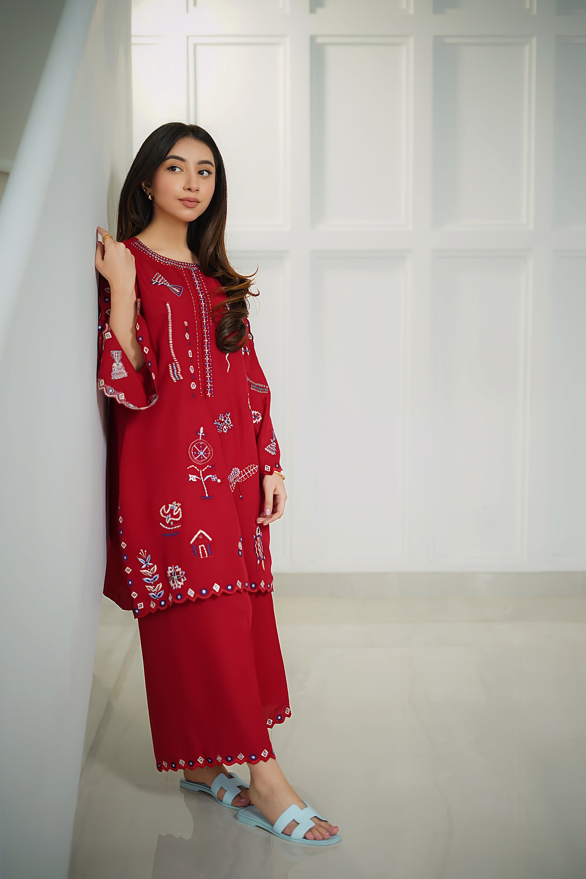 Elevate your everyday elegance with this beautifully crafted Silk Karandi 2-piece set in a deep red hue. The kurta features playful thread embroidery inspired by artisanal motifs, delicately placed across the front and sleeves for a statement yet easy-to-wear look. Paired with matching culottes adorned with scalloped edges and embroidered borders, this ensemble blends comfort with charm.