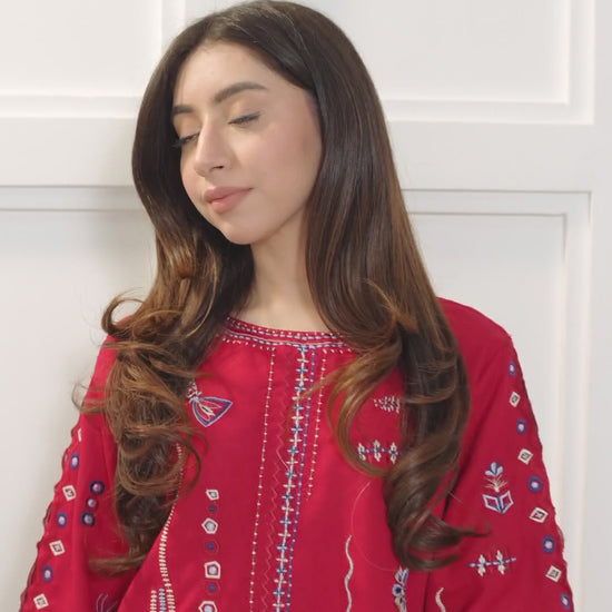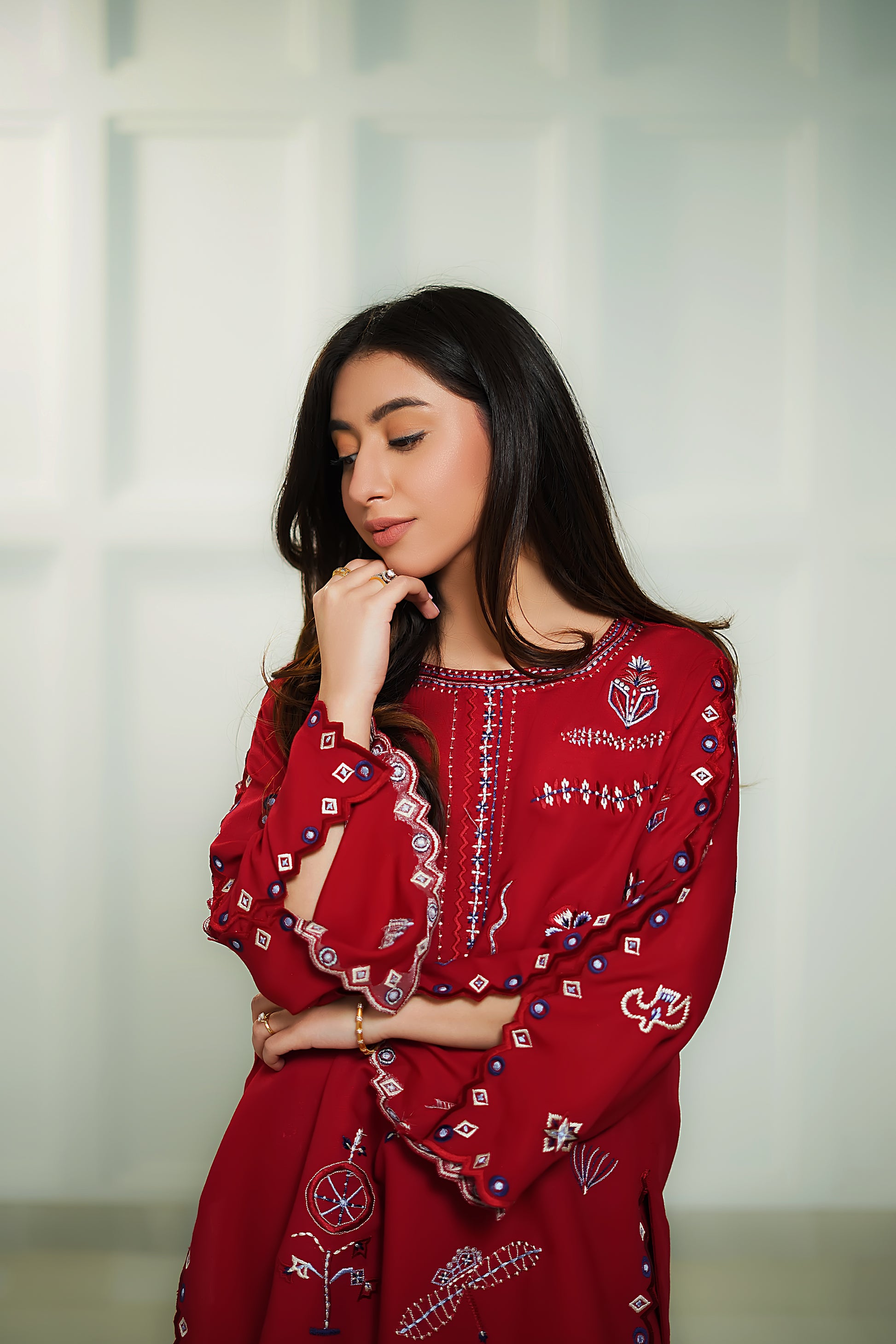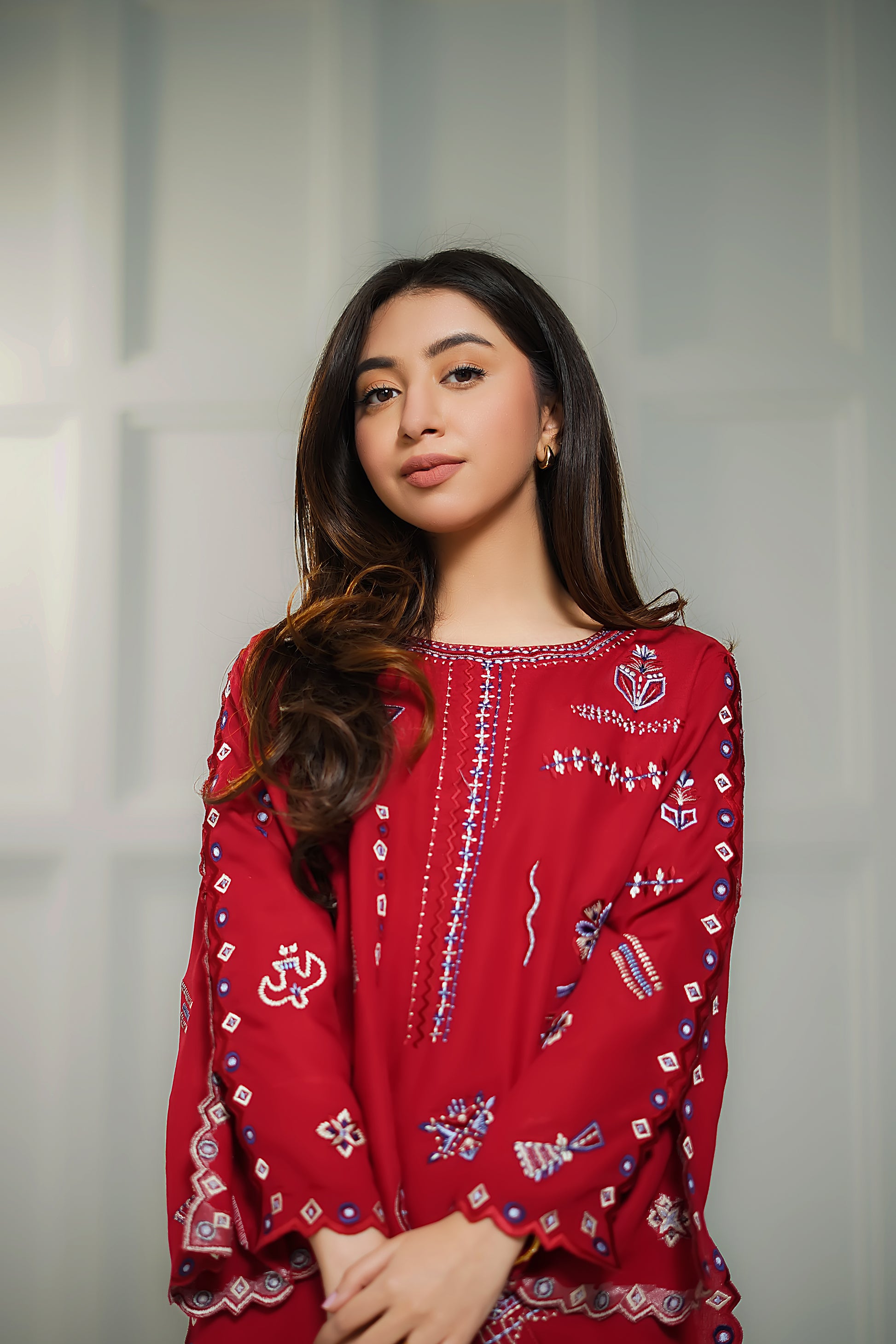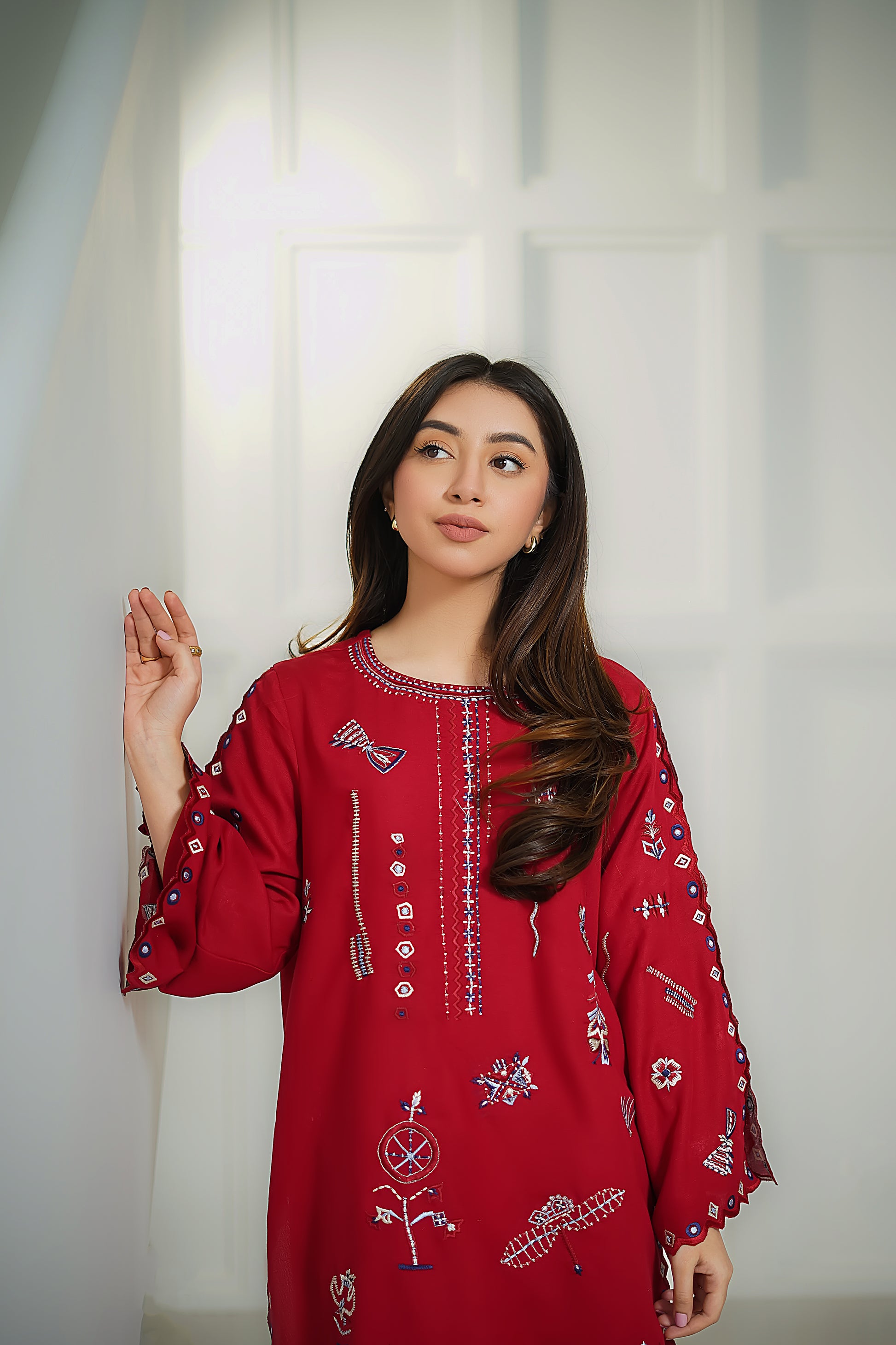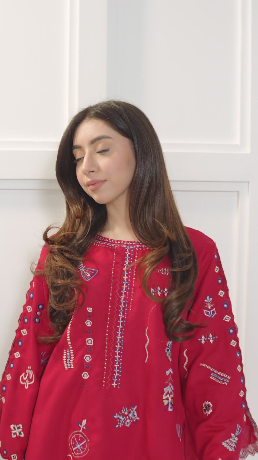Elevate your everyday elegance with this beautifully crafted Silk Karandi 2-piece set in a deep red hue. The kurta features playful thread embroidery inspired by artisanal motifs, delicately placed across the front and sleeves for a statement yet easy-to-wear look. Paired with matching culottes adorned with scalloped edges and embroidered borders, this ensemble blends comfort with charm.